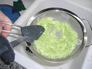 A continuación tritúralo en la Thermomix, o en cualquier batidora. Los trocitos obtenidos los colocas en un colador y aprietas con una cuchara con el fin de eliminar la máxima cantidad de agua posible.